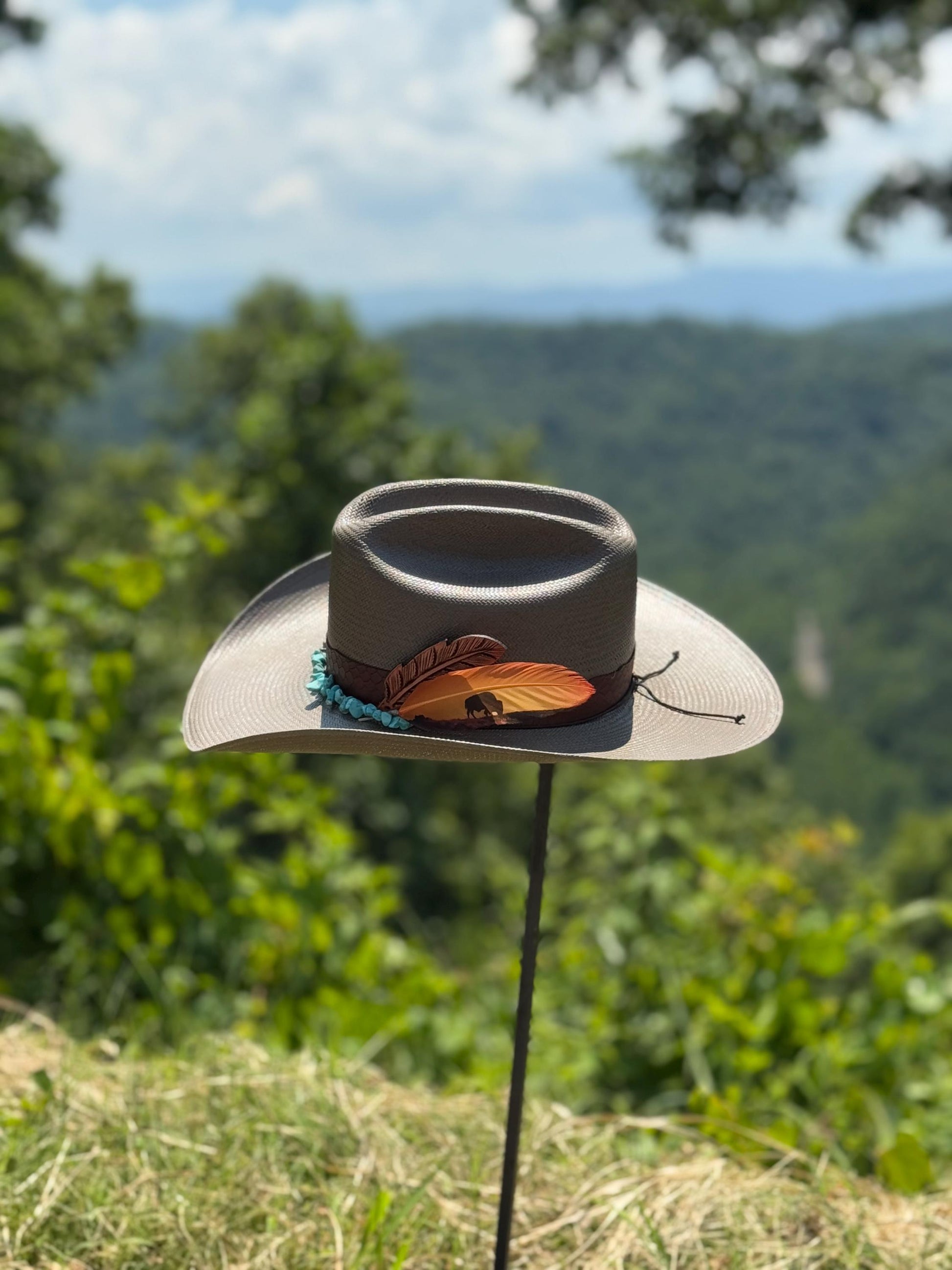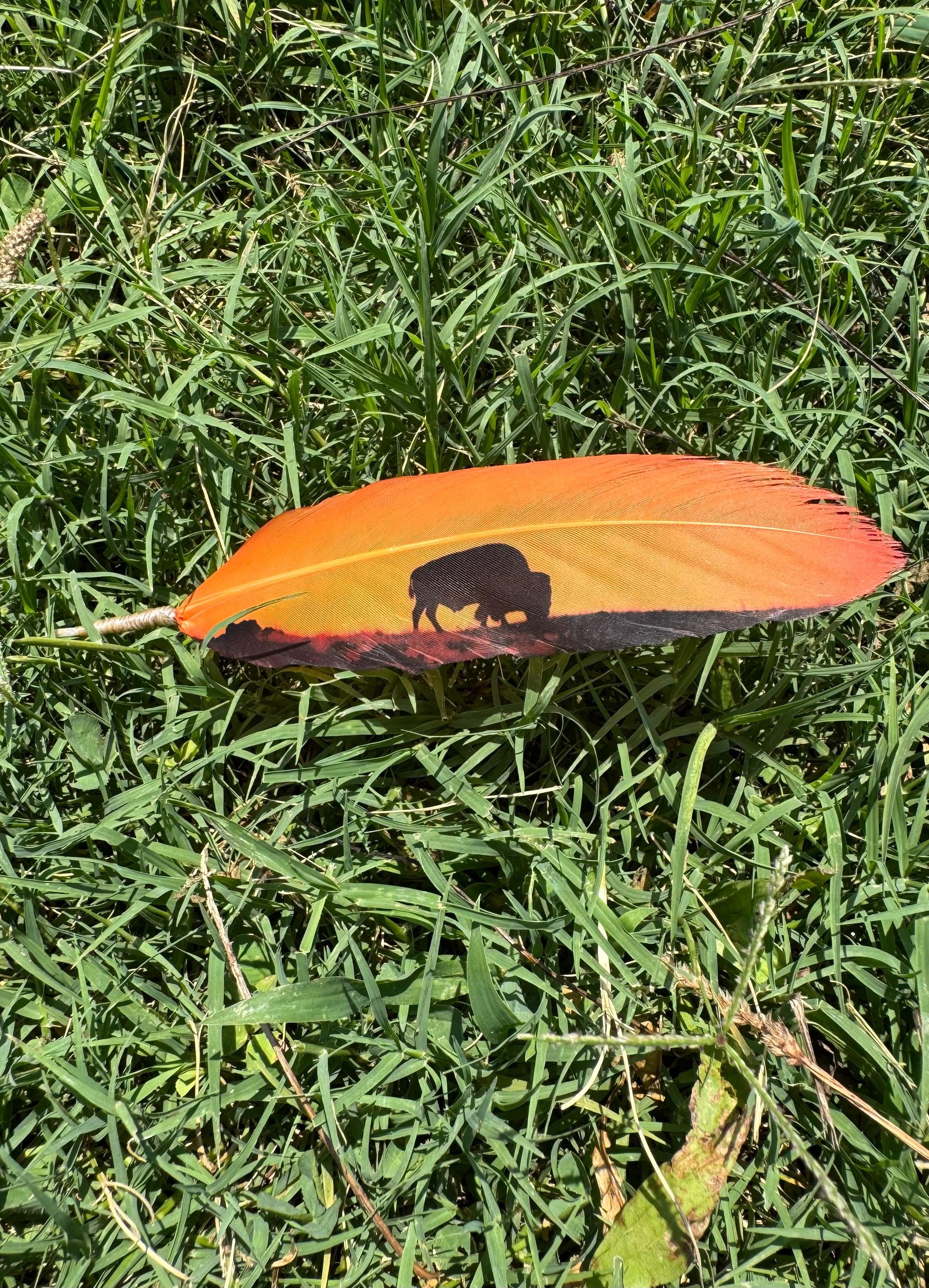 Buffalo Sunset captures the strength and spirit of the American West in a single, striking scene. Featuring rich orange sunset tones, this feather showcases the silhouette of a buffalo standing against the horizon—a quiet but powerful image rooted in heritage and resilience.