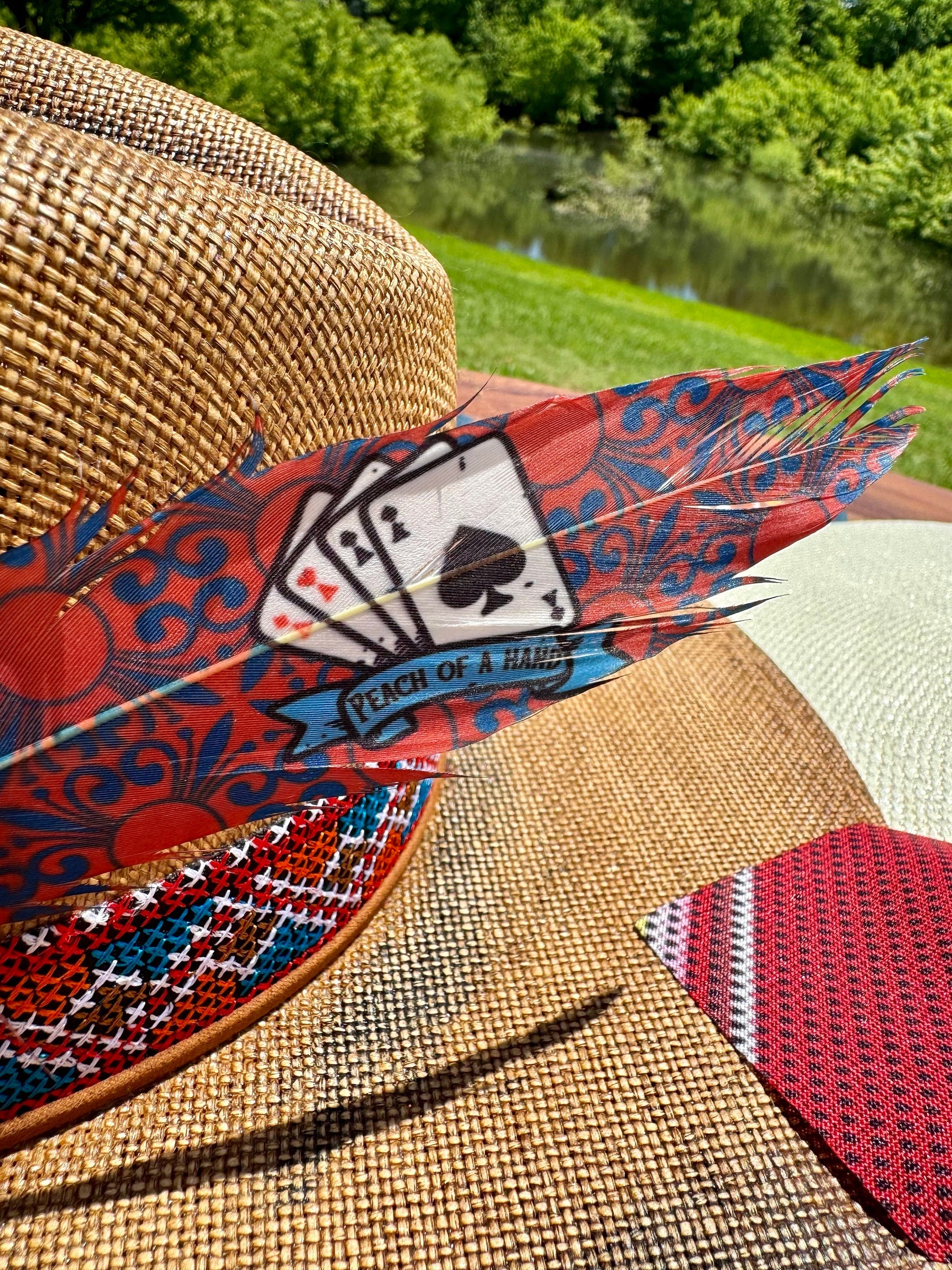 Peach of a Hand pays homage to one of the most iconic moments in Western film history, reimagined in true Buckaroo style. Set on a rich red feather with blue Western scroll detailing, this design features a row of aces from every suit—a subtle but powerful nod to a scene that defines confidence, resolve, and standing your ground.